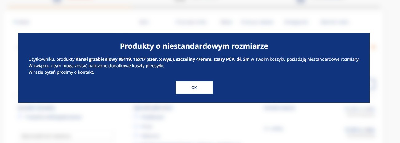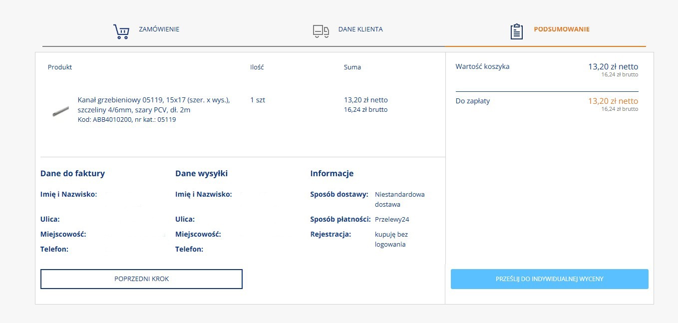 Należy zaznaczyć "ok", w kolejnym kroku wybrać "Przesyłka wielkogabarytowa". Następnie po uzupełnieniu danych i przejściu dalej pokaże się przycisk "Prześlij do indywidualnej wyceny". Wycena transportu zostanie przygotowana i przesłana zwrotnie. Należy oczekiwać na wiadomość e-mail z kosztami transportu. Link wysyłany w wiadomości mailowej kieruje bezpośrednio do koszyka z podanym kosztem dostawy. W ostatnim kroku należy sfinalizować zamówienie.