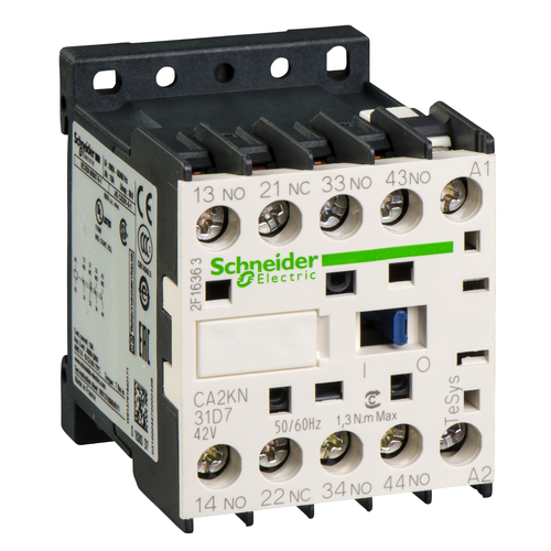 Stycznik pomocniczy CA2KN31D7 firmy Schneider Electric, to sterowniczy przekaźnik stycznikowy systemu TeSys serii CA2KN o prądzie cieplnym Ith 10A i konfiguracji styków sterowniczych 3NO+1NC. Napięcie cewki stycznika wynosi 42V 50/60Hz. Przeznaczony jest do stosowania w układach sterowania maszyn i urządzeń. Stycznik pomocniczy występuje również pod nazwą: stycznik sterowniczy, czy przekaźnik sterowniczy.